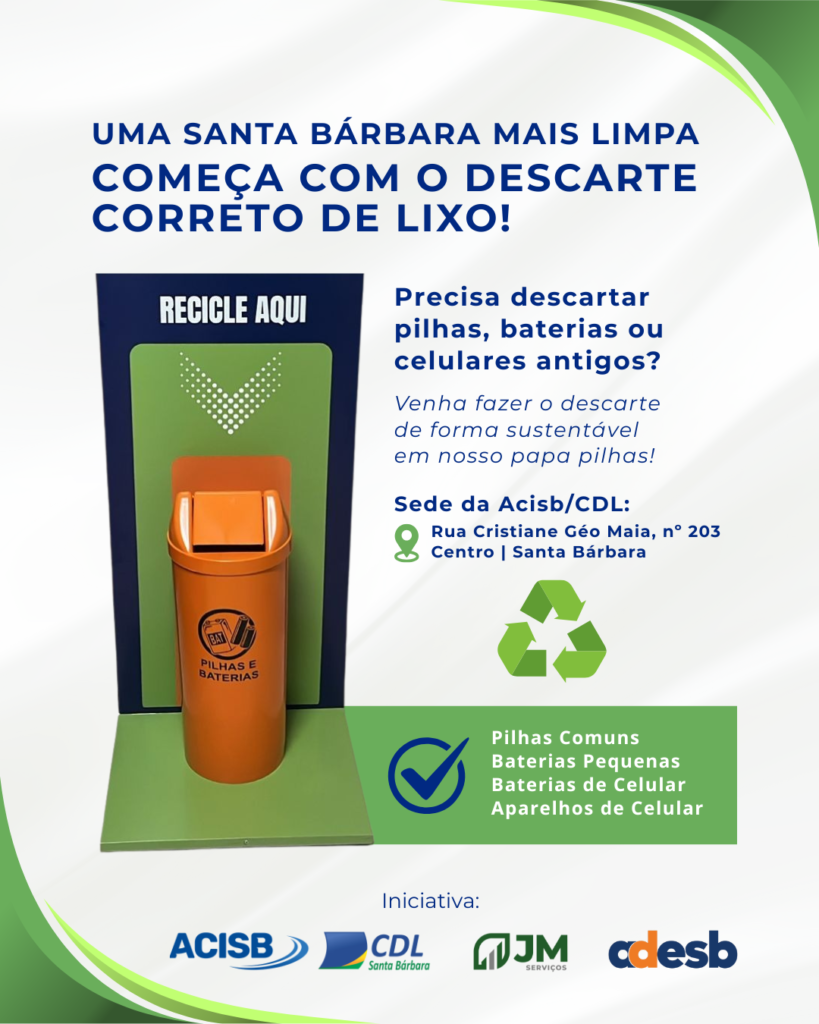 ♻️ Uma Santa Bárbara mais limpa começa com cada um de nós! Você tem pilhas, baterias ou celulares antigos guardados em casa? 🔋📱 Faça o descarte correto e contribua para um futuro mais sustentável! O papa pilhas está disponível na sede da Acisb/CDL, garantindo que esses materiais tenham a destinação ambiental adequada, evitando danos à […]